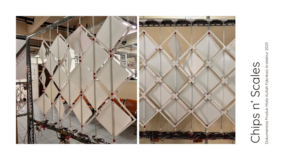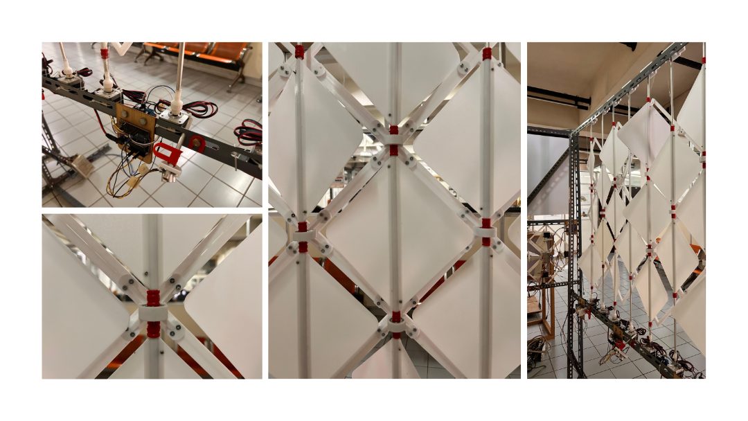 The kinetic mechanism in Breathing Dynamic Secondary Scales operates through a rotational motion system at each scale module. This motion is generated by a motor that rotates an axis, which is then transmitted through connecting rods and pivot joints attached to the main frame.