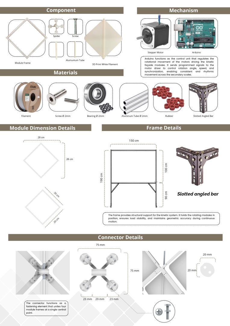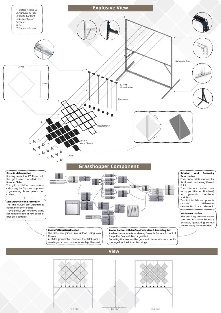 Breathing Dynamic Secondary Scales is a kinetic secondary façade system composed of small-scale modules that move rhythmically, resembling a breathing pattern. The system operates through an opening-closing mechanism to regulate shading. reduce heat gain and glare, and create a dynamic, adaptive building envelope.